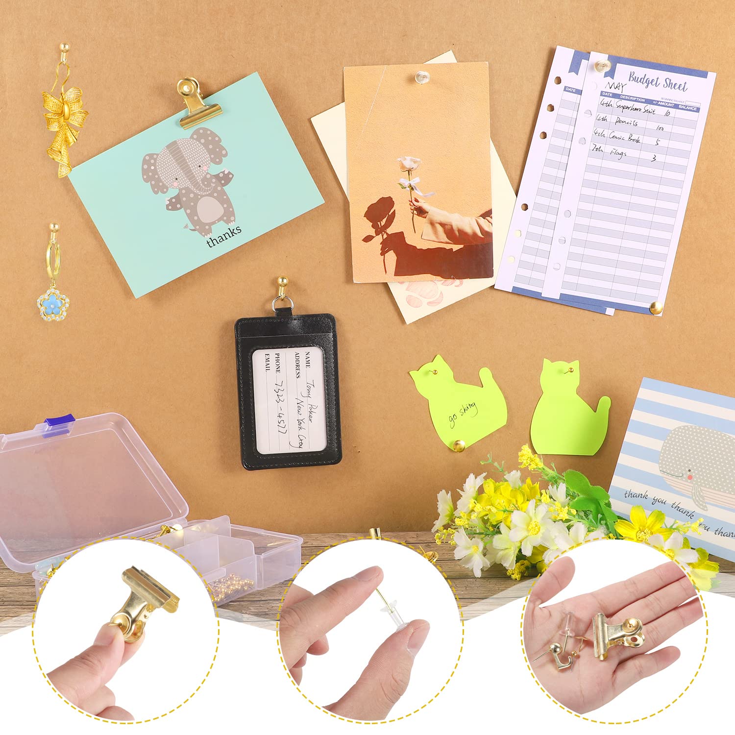 - ăEasy to UseăGold decorative thumb tacks can easily attach the product to the cork board and can be inserted directly, the thumb tacks with clips can hold the paper together without slipping, and the push pin hangers can also easily hang 20lb products, easy to use