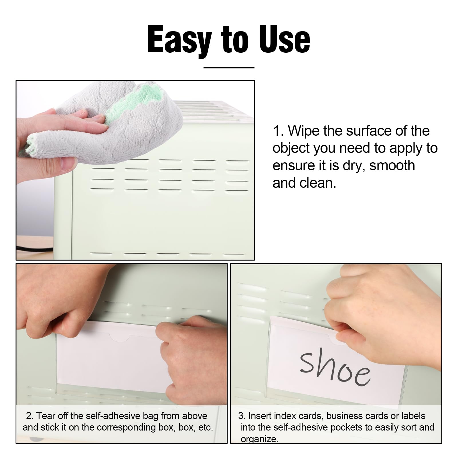 - Easy to Use: Place your photos, cards, labels, and more into the clear index card pockets and stick them wherever you need for easy labeling or organization. Adhesive label bags protect surfaces from fingerprints, water, dust or dirt.